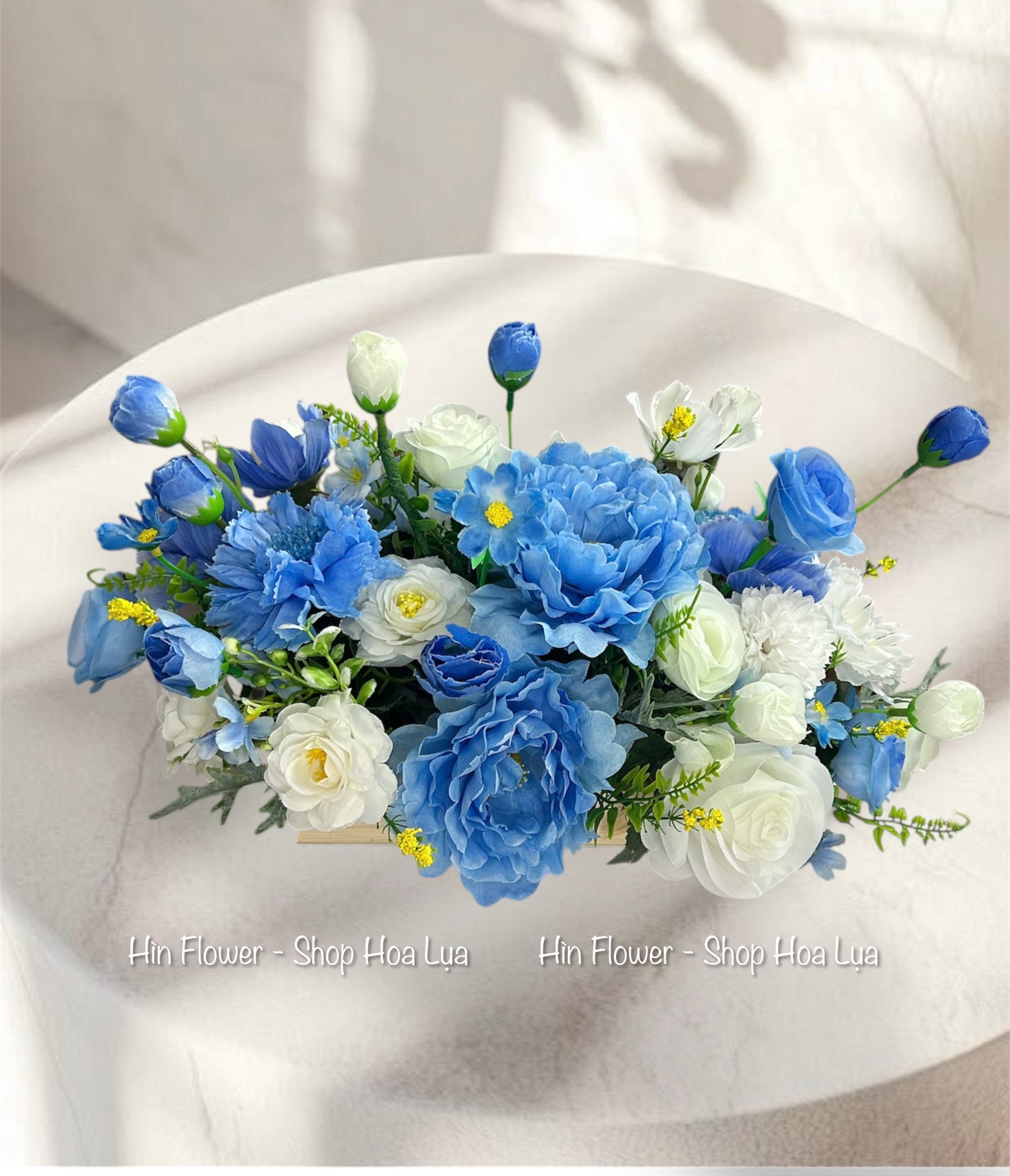 Hoa lụa là 1 loại hoa giả mà cánh hoa được tạo nên từ những chất liệu vải cao cấp. Đài hoa và nhụy hoa thường được làm từ nhựa mỏng để đủ độ chắc nâng đỡ những cách hoa lụa mềm mại. Khay Hoa Lụa Để Bàn Xanh là một trong những thiết kế hoa được Hìn Flower vô cùng tâm đắc.